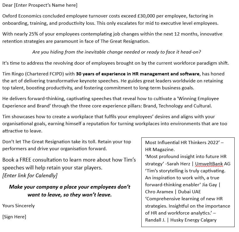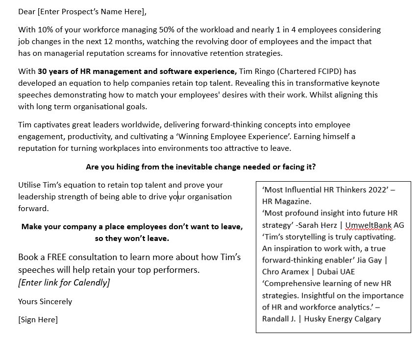 To spark an emotional response I emphasised why it is necessary to retain top talent as an employer, which led to me building Tim’s credibility so the prospect understands how their stress for this problem can be alleviated. Driving them to one clear call to action.