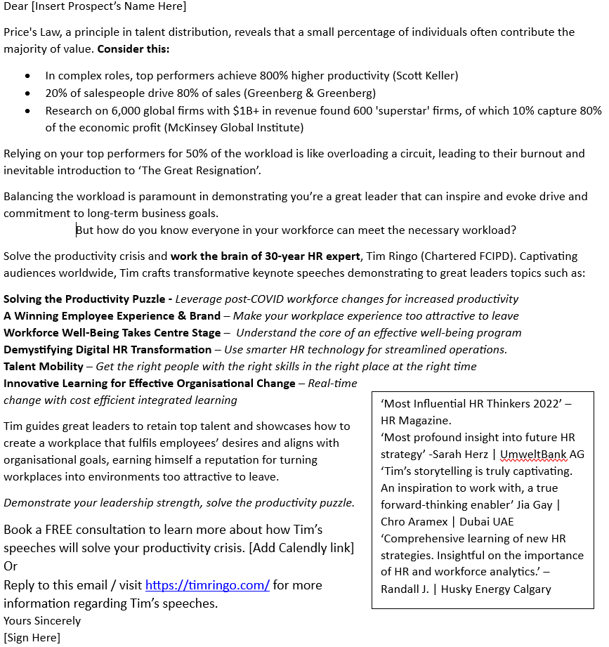 Tim wanted to promote his keynote speeches going forward. He was in need of an email to send to potential prospects that are likely unaware of him or his services as a cold outreach to entice them and inquire further. Below are the three variations that I presented to Tim.