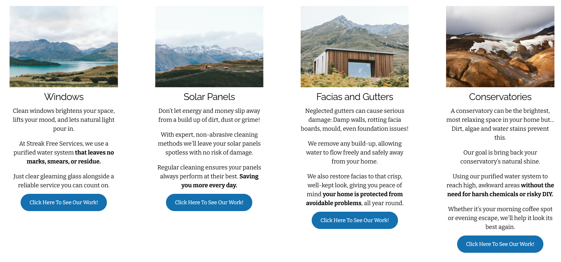 Conducting thorough research in the local area for window cleaning it became clear that the market is quite saturated. Meaning it was paramount to clearly display how Streak Free Services stands out. From market research it became evident there was a consumer pain that their window cleaners were not reliable in how often they provided their service and did not provide value for money. Streak Free Services has become renowned locally for it’s high quality service and reasonable pricing for said service. I struck on this from the headline and lead on the homepage and supported this with many testimonials that only amplify what is being said. And no matter what page of the website you are on, it is crystal clear how to contact Streak Free Services and so always leading the user to my client’s desired action.